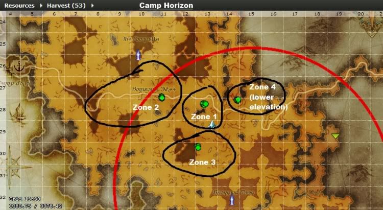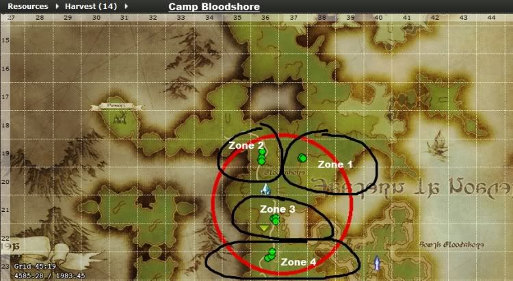 The spot I recommend grinding at would be to stay close to the two most west harvesting nodes. Chances are that there will be a tree in that area available as well, what you will want to do is just continuously cycle between the two harvesting nodes and the tree node(s) in that small area. You can get a good 15k+ SP here in about 1hr doing this. Both harvesting and logging nodes only require you to fully gather at two other nodes in order to resupply.