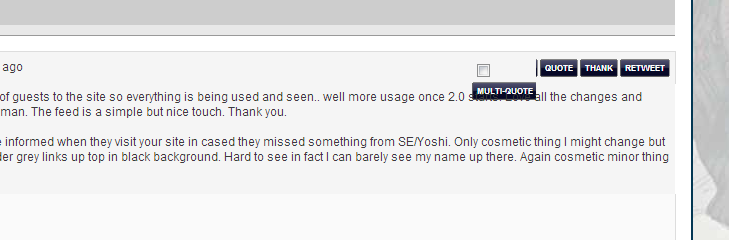 It just helps to keep people informed when they visit your site in cased they missed something from SE/Yoshi. Only cosmetic thing I might change but just my opinion is the header grey links up top in black background. Hard to see in fact I can barely see my name up there. Again cosmetic minor thing but that's it for now. |