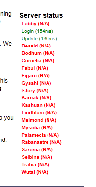 Vicious wrote:You sure man? On my index page it's just showing ms's, text or nothing at all for some servers. Maintenance today too so remember later on they will all be down for a short bit. It should look something like this: Lobby (156ms) Login (155ms) Update (155ms) Besaid (136ms) Bodhum (159ms) Cornelia (159ms)Fabul (N/A)Figaro (155ms) Gysahl (159ms) Istory (158ms) Karnak (159ms) Kashuan (155ms) Lindblum (156ms) Melmond (156ms) Mysidia (154ms) Palamecia (155ms) Rabanastre (159ms) Saronia (158ms) Selbina (135ms) Trabia (155ms)Wutai (N/A)The green servers are online, the red with bold are offline. As mentioned I am getting the results from Zam and when I access the front-page I get the result above... Have you tried refreshing? |